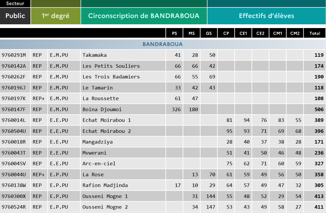 Les chiffres clés dans la circonscription de Bandraboua à la rentrée scolaire 2024/2025 :